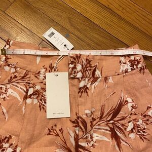 These blush linen shorts come in a resort-ready tropical floral motif. High-rise. Banded waist. Zip fly and latch closure. Two slash pockets. Two back welt pockets. Unlined. In blush/floral.