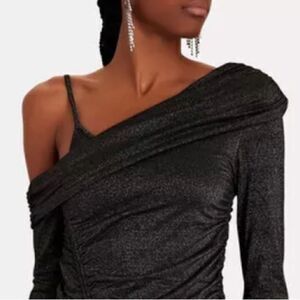 This 'Sabine' lurex midi makes a shimmering statement in metallic knit, flaunting its evening readiness with an off-the-shoulder silhouette and asymmetric ruching.