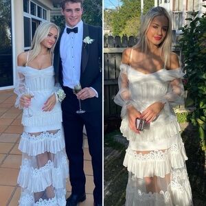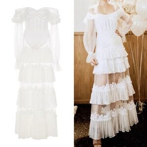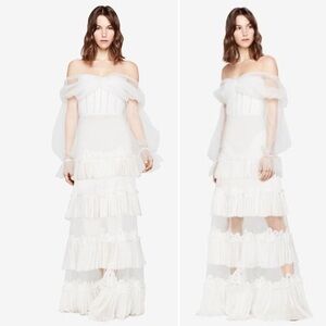This sheer tulle gown features a long-sleeve off the shoulder design, a built-in bodysuit with a zipper and hook/eye closure, detachable shoulder straps, and floor length skirt with pleated tiers.