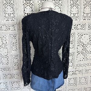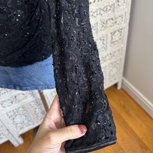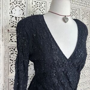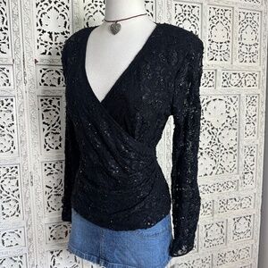 NWT JS Boutique Black Lace Beaded Sequin Fairycore Whimsygoth Faux Wrap Blouse Sz Small