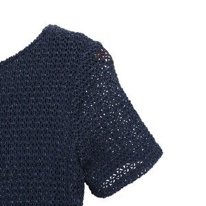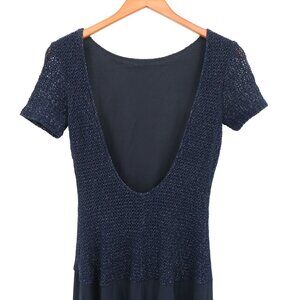 Top portion is a navy blue knit with hints of silver metallic throughout. Main body is lined. Sleeves are unlined and see-thru. Back features a low scoop. 78% Tactel, 8% Lurex, 7% Spandex. Skirt: 100% Polyester