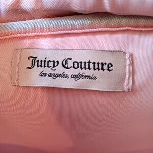 This is a large Juicy Couture travel cosmetic bag. It is constructed of plush black velour with nice gold hardware and piping around the edges. The bag has the brand name Juicy detailed with lovely sparkling rhinestones on the front flap. One of the gold zippers has a very cute bow and heart charm pull. This is a very roomy cosmetic bag and it is gorgeous. Don't travel without it!