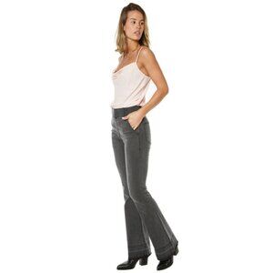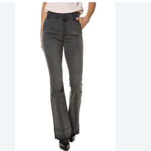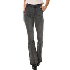 A high-rise pair of bootcut jeans feature released hems and a pull-on waistline for comfort throughout the day.