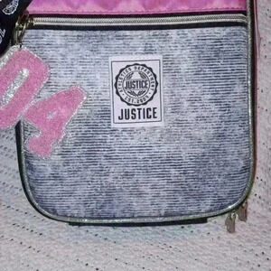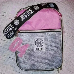 BRAND NEW WITH TAGS! JUSTICE GIRLS LUNCHBAG. ADJUSTABLE REMOVABLE STRAP. ZIPPERED FRONT COMPARTMENT. CARRYING HANDLE. SILVER GLITTER FUZZY KEYCHAIN ATTACHED. LARGE HOLOGRAPHIC JUSTICE GRAPHIC ON THE BACK. PLEASE SEE PHOTOS FOR MEASUREMENTS. NON SMOKING NON PET HOME.