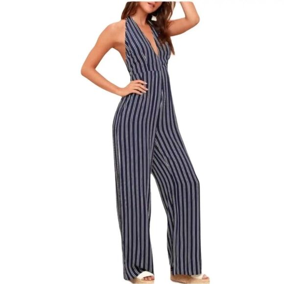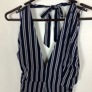 NWT Jack by BB Dakota All The Way Up Blue White Striped V-Neck Halter Jumpsuit