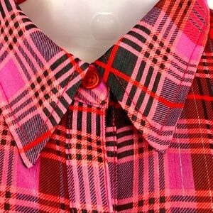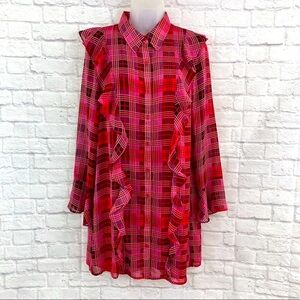 Jack by BB Dakota - Flowy chiffon cherry red shirt dress. Festive Holiday plaid colors in red, black, pink, with silver and gold threading woven through out. Detachable red camisole with adjustable straps. Vertical Flounce Ruffled Front Trim, Flounce Cuff sleeves, Inverted Back Pleat, Button Front. Pretty and comfortable. Great for the holidays or travel.