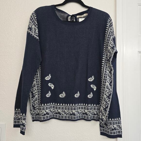 NWT Jacqueline B Cotton Sweater Size L Navy Blue Boxy Fit Paisley Printed Tie Neck Long Sleeve