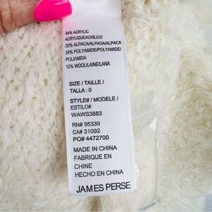 Women’s Size 0 ( XS /S) Oversized. Google James Perse Sizing if you have a question . Pit/Pit:19”…..Sleeves:23”…..Top/Bottom:25”….James Perse Crème Fuzzy Wool Blend Sherpa Hooded Pull over Sweater. Relaxed fit, Sherpa finish, side slits, drawstring hood. New with Tags. A……..829/101325…….tags# quite luxury, James Perse, cozy, fuzzy, weekend wear, hoodie, relaxed fit, sweater, wool blend, casual