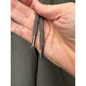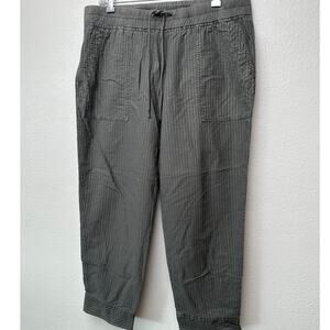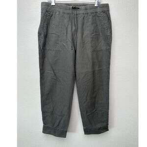Easy pull-on joggers featuring an elastic drawstring waistband, vertical pinstripe pattern, and roomy front patch pockets with additional back patch pockets. Tapered, slightly cropped leg with cuff detail adds a clean finish. Versatile utility style that works for travel, weekend wear, or casual days. James Perse size 4.