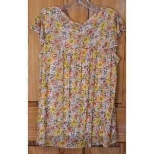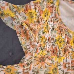 This blouse from Jane and Delancey is New w/ Tags. Gold, Orange, Green and Cream Floral Pattern. Smocked at Neckline and Shoulders. Flutter Sleeves. Lightweight. Lined. Size Large.