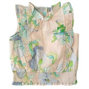 Sleevless with button back closure. Light pink with blue and green flowers. Ruffles and smocked hem details. So beautiful for the spring and summer!