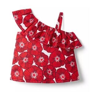 New with tags Janie and Jack girls’ size 2T one-shoulder top in a bold red poppy print. Features a fun, ruffled neckline with a single strap and full lining for comfort. The lightweight 100% cotton batiste makes it perfect for sunny days, vacations, or festive outings. Easy to pair with shorts or capris for a stylish summer look. Originally retailed for $42. Sleeveless, breathable, and adorable!