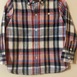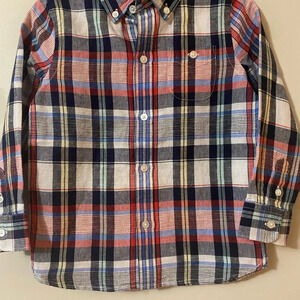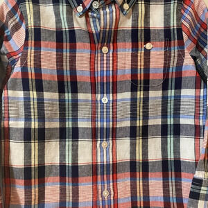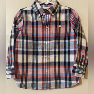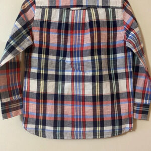 Red and navy plaid long sleeve button down shirt