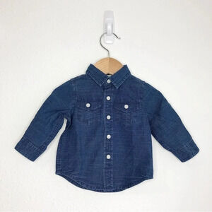 Navy blue stripe button front shirt, long sleeve with roll tabs to keep cuffs in place, collared, front button pockets, 100% cotton, baby boy shirt, button down.
