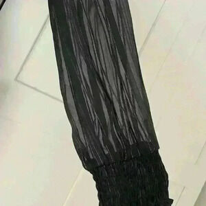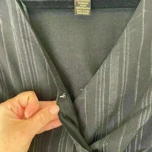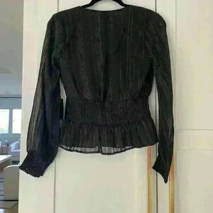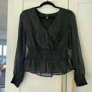 Perfect for dressing up or adding a touch of sparkle. Black with metallic detail. Small peplum with a v neck.