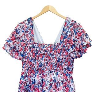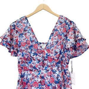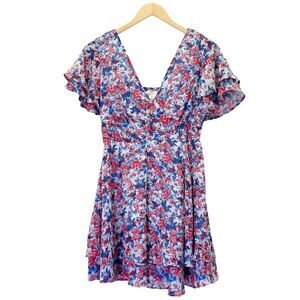 NWT Japna Americana Floral Ruffled Flutter Sleeve Mini Dress Red Blue Size Large