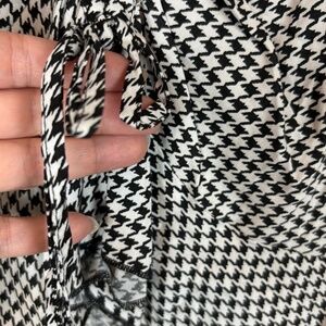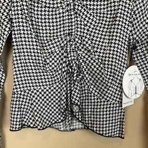 NWT Japna Black/White Houndstooth Cropped Long Sleeve Blouse; Elastic Cuffs; Ruffle Waist Hem; Wide Neckline; Style Me As You Want Tie Design Front; Size M; When lying flat, measures 16" pit to pit and approximately 20" in length from top shoulder to front bottom hemline; Fabric and Care instructions shown in pictures.