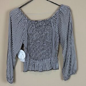 NWT Japna Black/White Houndstooth Cropped Long Sleeve Blouse with Ruffle Hem