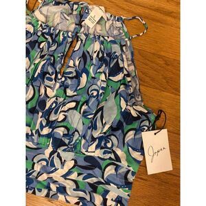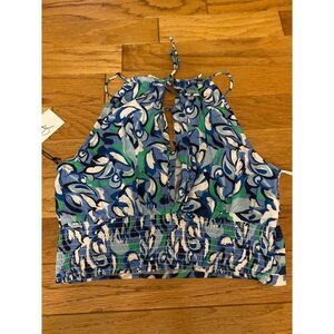 NWT Japna Womens Sleeveless abstract print blue cropped pleated Halter Top Large