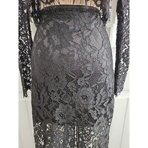 This is a Jason Wu 2-piece set in size 2, featuring a black lace pencil skirt and matching top with long sleeves and a round neckline. The set includes lace and fringe accents, with a zipper closure and a slit detail on the skirt. Suitable for various occasions such as travel, parties, and formal events, this designer outfit is perfect for all seasons and has a $400 MSRP.