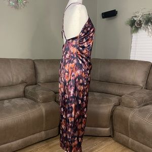 PERFECT DATE NIGHT DRESS!!! This gorgeous, satiny dress is from designer Jason Wu. The pattern is a beautiful watercolor style with orange, bronze, purples & nude colors on a deep navy base. This dress has a high neckline with adjustable spaghetti straps, a sexy low back line & a 9” back slit for extra flirtiness. You can dress this dress up with some stilettos & a clutch or dress is down with some Docs & a motto style jacket, very versatile.