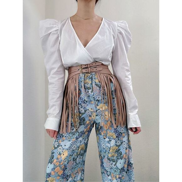 This Jason Wu wrap blouse effortlessly combines contemporary design with a wrap-style silhouette and puffy sleeves, offering a unique style that's perfect for both casual and dressed-up occasions. Featuring: - V shape neckline. - Long, puffy sleeves. - Wrapped, self-tie closure. - Cotton, spandex. Size: Small. Approx lay flat measurements: Shoulder 23" Pit to pit 17" Sleeves 26" Length 21" Condition: new with tag. WX 4217-860-6PA.