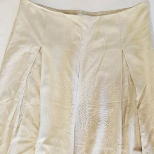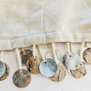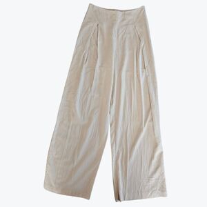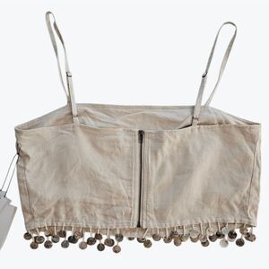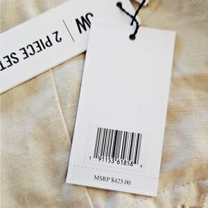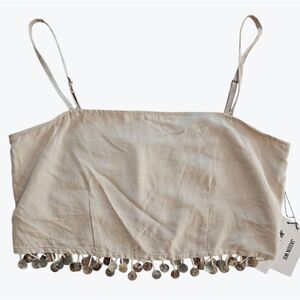 This beautiful linen blend two piece set is the perfect look to take you from lounging on the patio to sipping aperitifs at the bar! Lightweight linen-blend fabric shapes this airy two-piece set. Adjustable spaghetti straps support a princess-seamed, cropped bodice with a faux shell beaded fringe. The matching pants are tailored to a T. Ultra high waisted silhouette with dramatic pleating, and wide legs that finish. Hidden zipper/clasp. This set it brand new with the original tags.