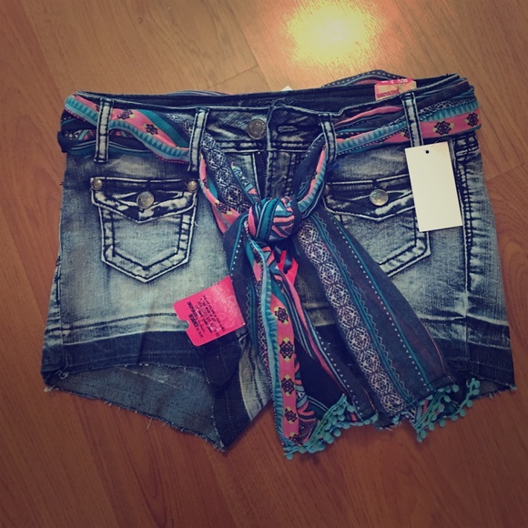 NWT Jean Shorts. Adorable shorts. Great fade design and pocket detail. Approximately 2.5" inseam. Open to offers, bundle and save more! Belt scarf not included. Trade value: $25