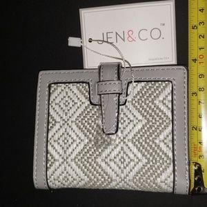 This is a brand new wallet by Jen & Co. It is grey & white with a tribal chevron pattern. It had credit card and ID window as well as a slot for bills. It is vegan leather on the trim. It is 4.75 x 4. Pet and smoke free home.