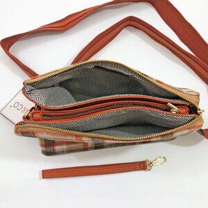 Jen & Co. New with tags sales sample model Izzy plaid cross body or wristlet clutch bag. This model Izzy has beautiful fall colors of brown, rust, white, and tan. It's crafted from fabric and accented with vegan leather for a responsible, yet luxurious finish. This Izzy plaid crossbody isn't just a bag; it's a versatile companion ready to make a statement with any ensemble.