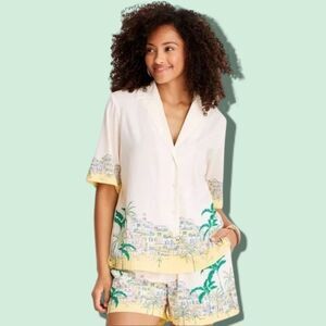 Jenee Naylor x Target Future Collective tropical travel shorts in cream with yellow and green palm print and town motif, new with tags.