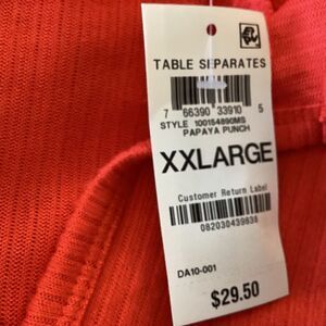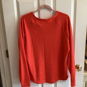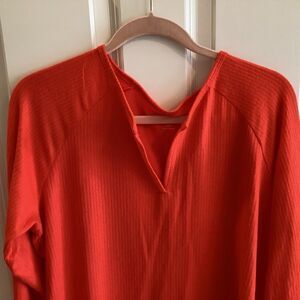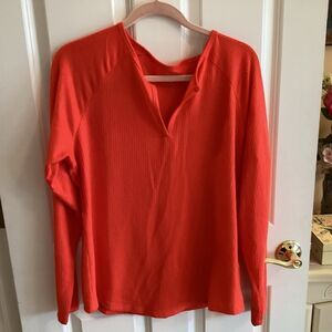 New with tags. Jenni, a Macy’s brand, women’s super soft long-sleeved pj top in solid orange. Long sleeved, V-Neck Washable polyester and spandex blend. Available in Women’s Sizes S and XXL. Showing photos of front and back sides along with fiber contents and care tags.