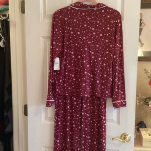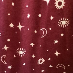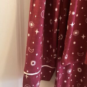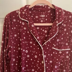 New With Tags. Jenni Intimates/Macy’s Brand women’s 2 pc pajama set in dark plum with white moons and stars print all over. Straight leg long pants have a fully elasticized waist with working drawstring. They feature white piping at the cuff. The top is long sleeved, buttons up the front and has a collar and working pocket. White pipping accents the collar and front, cuffs and pocket. Soft jersey knit is rayon and spandex blend which is machine washable. Showing photos of front and back sides along with fiber content and care tags.