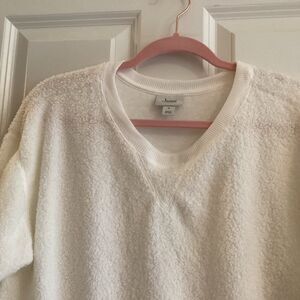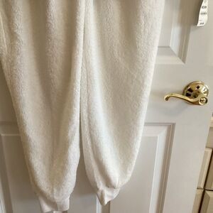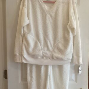 New with tags. Jenni Intimates/ Macy’s brand Women’s 2 pc loungewear/pj set in white boucle polyester fabric. A beautiful upgrade to a sweat suit. Long pants with knitted waist band feature working drawstring and knitted cuffs. Round neck sweats her style long sleeve top features knitted neckline, cuff and waistband. Two large working side slit pockets on the top as well. Showing photos of front and back sides along with fiber content and care tags.. Stay warm and cozy!
