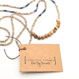 This handmade beaded necklace by Jennifer Thames, featuring natural matte jasper stones and sparkling faceted glass beads. The necklace has a toggle closure and measures 34 inches in length. The main stone color is brown, and the secondary stones are glass. The beaded style and round shape add a unique and stylish touch to the jewelry, making it a standout accessory for any outfit.