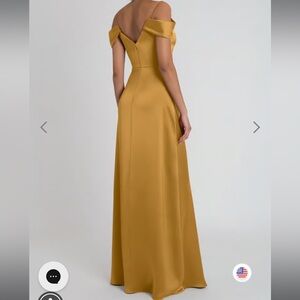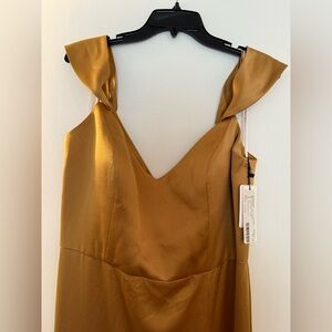 NEW with Tags and garment bag!! Elegant Gold Off-Shoulder Evening Gown! Step into elegance with this stunning off-shoulder evening gown. Luxurious luxe satin fabric, perfect for any formal occasion. This dress features a sleek silhouette and a stylish slit for added allure. Please see picture of size chart for sizing/ measurements.