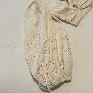 The Getaway is a carefree top with perforated swirls throughout, smocked back panel, blouson sleeves with cinched cuffs and front ring detail.