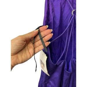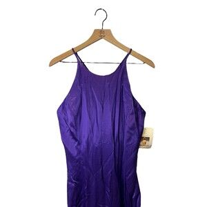 This stunning Jessica McClintock for Gunne Sax dress is fit for a princess. The satin fabric in a beautiful shade of purple is accented with rhinestones on the strappy back detail, adding a touch of glamour to the dress. The dress features a high neck halter neckline, sleeveless design, and a side zip closure. I believe this piece is from 1997 based on the tags. Never worn - new with tags. Some variation in fabric at neckline on INSIDE of the fabric lining. Not noticeable from outside.