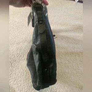 Stylish black and silver vegan leather bag. Features a front zipper pocket. Comfortable handle for easy carrying. Comes with a detachable crossbody strap. This item is new with tags.