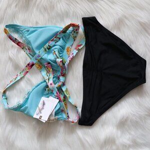 NWT Jessica Simpson Blue Black Floral Print Bikini Swim Set Size Small