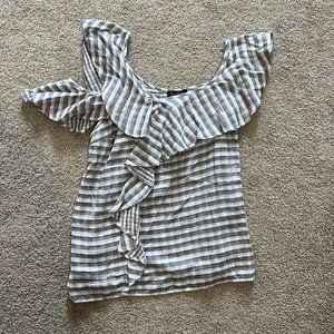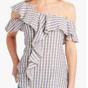 Brand new with no flaws! Off-the-shoulder, asymmetrical ruffle design on breezy woven gingham. Ivory, blue, and blush color.