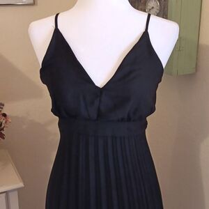 A spin on the little black dress, this one actually does spin while you're dancing!The bodice is V neck with gathers under chest. Adjustable spaghetti straps. Back zip, fully lined. Ties create a perfect fit. Size XL measures 38-40 at chest, 42 under chest, 48 at hips (lining).43 long from shoulder to hem. A classic, but different enough to get noticed.