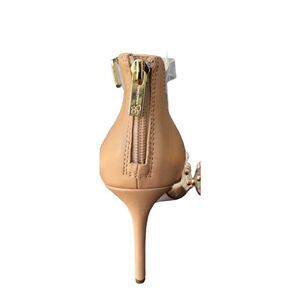 Now the is a fabulous pair of shoes compliments any outfit. Uniquely styled for the modern woman. They are truly super gorgeous.Colors: Beige/Khaki(Tan leather. :Zipper back. Clear front and straps..Detail: metallic gold balls.