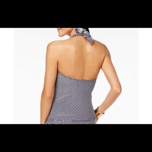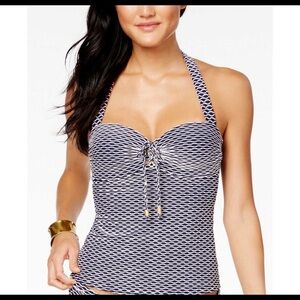 NWT Jessica Simpson Twiggy Striped Tankini Top. Sweetheart neckline with gold-tone hardware, tie between the bust. Halter straps tie at back neck. Pullover styling. Non-removable soft cups with underwire. Size Small. Navy.