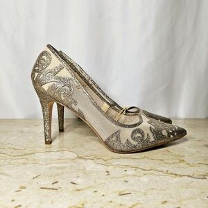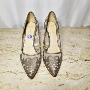 NWT - no box | Jessica Simpson | Womens Elegant Sheer Tan Mesh 3.5" heel Pumps with Glittery Gold Scroll detailing | Excellent Pre-owned/never worn condition other than to try on in store | marks on bottom are only from tryin on and from storage | Size 8.5