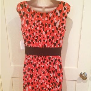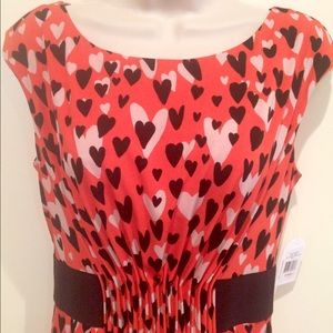 Red orange dress with black and white heart pattern. Never been worn. Fabric is a stretch knit, waist has a wide black elastic and ruching in the front. Zip back. Smoke and pet free home.