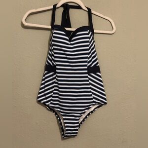 Stylish navy striped swimsuit perfect for beach days. Enjoy comfort and elegance with this chic design.