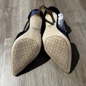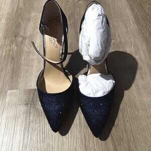 NWT Jewel Badgley Mischka Jailene Navy Satin Pointed Toe Ankle Strap Heels SZ 8