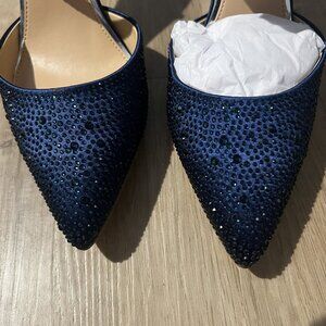 navy satin heels, ankle strap shoes, pointed toe heels, Jewel Badgley Mischka, navy party shoes, size 8 heels, elegant navy shoes, adjustable strap heels, navy formal shoes, women's dress shoes, navy pumps, embellished heels, satin pumps, date night, party, event, girls weekend, summer, winter, fall, spring