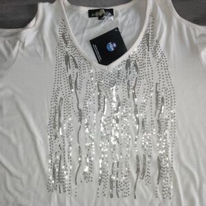 * Top has a kangaroo pocket, open shoulder and sequen detailing.